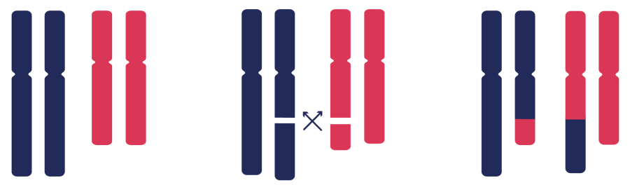 • Reciprocal translocations – these occur when pieces of genetic material break off from two different chromosomes and swap places. People that carry a balanced translocation can create embryos that have either the same balanced translocation, the unbalanced form of the translocation (where there is a gain or loss of chromosomal material), or a completely normal set of chromosomes.